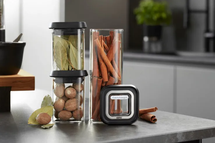 PANTRY von GEFU eignet sich besonders gut für Gewürze und Kräuter, kann aber auch zur Aufbewahrung von vielen anderen Lebensmitteln und Utensilien benutzt werden. Zwei Behälter haben ein Fassungsvermögen von jeweils 180 ml, eine Dose ist etwas größer und fasst 400 ml. Das Vorratsdosen-Set ist spülmaschinengeignet und bringt drei praktische Haftetiketten zum Beschriften mit. Die schwarzen Deckel sind in der Mitte transparent und ermöglichen somit auch von oben einen Blick auf den Inhalt.