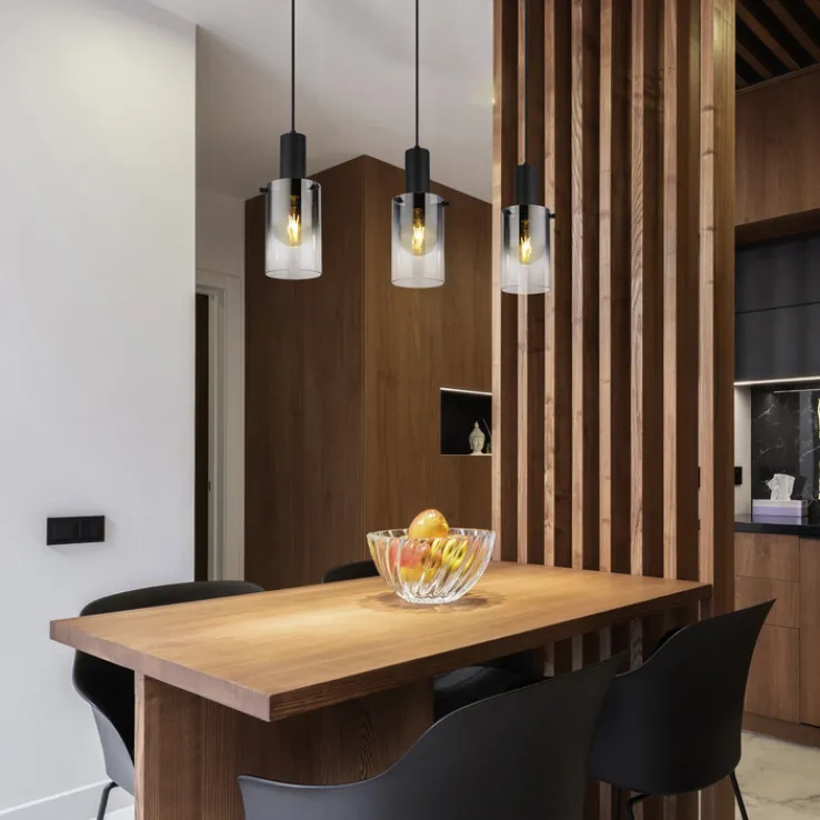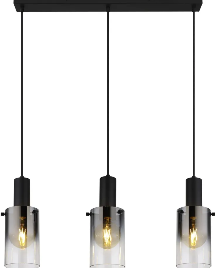Die Balkenpendelleuchte der Serie Florentina von Globo vereint modernes Design mit industriellem Stil. Die Leuchte besteht aus hochwertigem Metall und Glas und präsentiert sich in einem eleganten Schwarz mit rauchfarbenen, klaren Glaselementen. Die zylindrische Form der drei Lampenschirme verleiht der Leuchte eine zeitlose Ästhetik, die sich nahtlos in verschiedene Wohnstile einfügt.