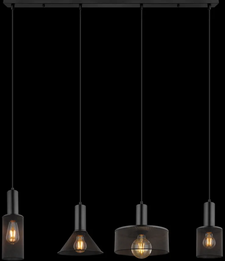 Das 4-flammige GLOBO Retrofit Balkenpendel JEDD hat ein zeitloses Design und passt in den modern eingerichteten Wohnbereich. Durch die elegant gestalteten Lampenschirme in schwarzfarbiger Geflechtoptik ist das höhenverstellbare Pendel der Blickfang über einem großen Wohnzimmer- oder Esstisch. Das tolle Design schafft zahlreiche Kombinationsmöglichkeiten und komplettiert die geschmackvolle Einrichtung. Das Balkenpendel sorgt für angenehmes Licht, das nicht blendet.