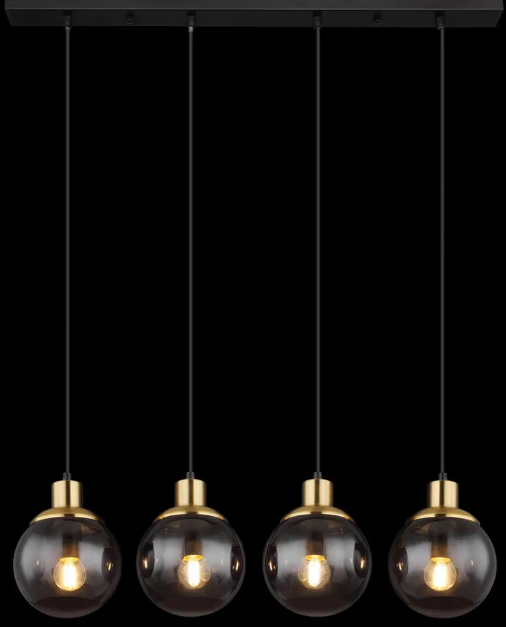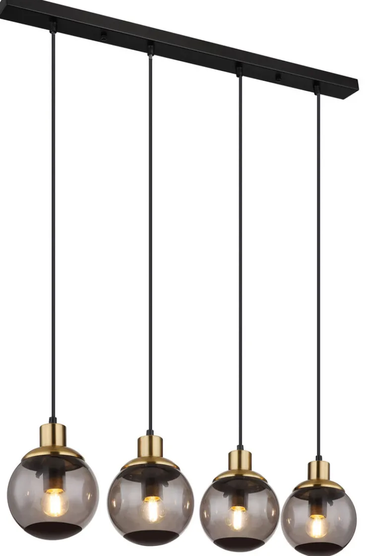 Das Retrofit Balkenpendel POTTER von GLOBO überzeugt mit seinen stilvollen kugelförmigen Lampenschirmen in einer attraktiven Farbkombination aus schwarz, rauchfarbig und messingfarbig. Es ist 75 cm breit und taucht seine Umgebung in ein behagliches, warmes Licht.