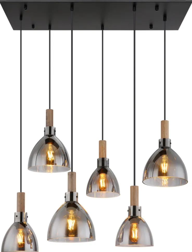 Das 6-flammige GLOBO Retrofit LED Balkenpendel MATTEA ist 120 cm hoch, 80 cm breit und 30 cm tief. Das Gewicht beträgt 7,06 kg. Es ist aus schwarzem Metall und grauem Rauchglas sowie braunem Holzdekor.