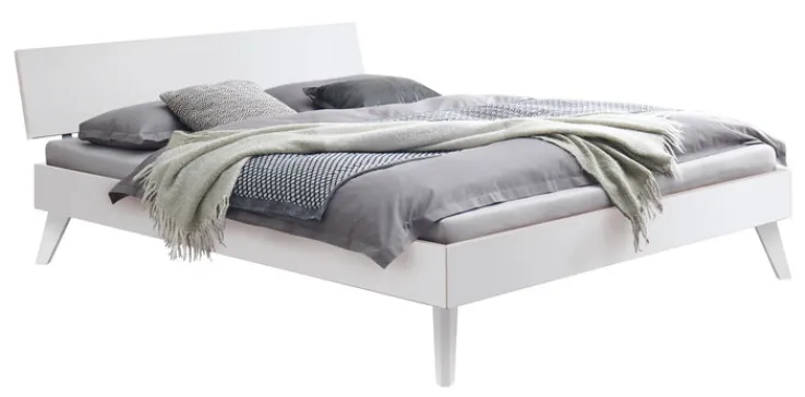 Das robuste Bett mit den schräg stehenden Füßen und dem ebenfalls schräg arrangierten Kopfteil, das eine Höhe von 74 Zentimetern hat, wird ohne Matratze und ohne Lattenrost geliefert. Die maximale Belastbarkeit des schlicht elegant designten Modells beträgt 170 Kilogramm. Das Bettgestell passt sowohl in helle Schlaf- als auch in gemütlich mit weiteren Möbeln eingerichtete Gästezimmer.