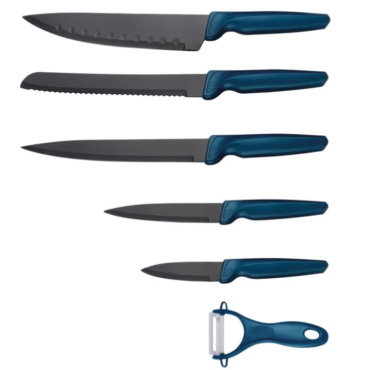 Dieses sechsteilige Küchenmesserset besteht aus fünf Messern und einem Sparschäler. Die Klingen der Messer sind aus Stahl gefertigt und präsentieren sich in einem dunklen, matten Farbton. Die ergonomisch geformten Griffe zeigen sich in einem kräftigen Petrolblau und verfügen über eine glatte, leicht glänzende Oberfläche. Die Farbgebung der Griffe verleiht dem Set einen modernen und ansprechenden Charakter. Das Set umfasst verschiedene Klingenformen, darunter ein Kochmesser mit Kullenschliff, ein Brotmesser mit Wellenschliff, ein langes Tranchiermesser sowie zwei kleinere Allzweckmesser. Ergänzt wird das Set durch einen passenden Sparschäler mit ebenfalls petrolblauem Kunststoffgriff und weißer Klinge.