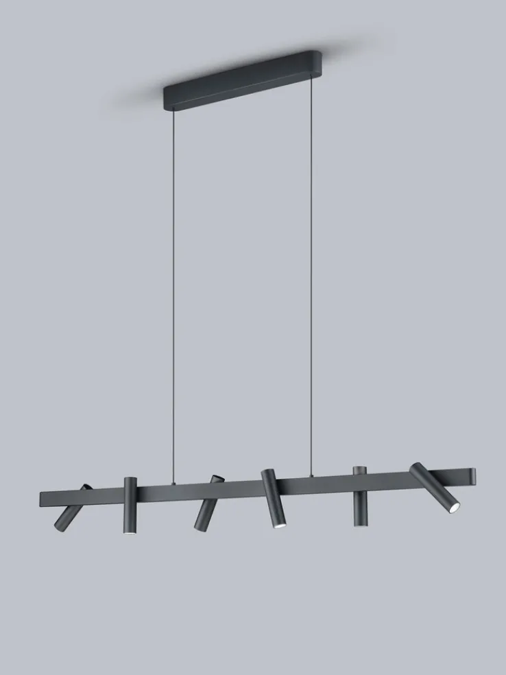 Die 120 cm breite Pendellampe von helestra ist aus Aluminium hergestellt und hat eine schwarze, mattierte Oberfläche. Sie kann mit einem Abstand von 150 bis 210 cm zur Zimmerdecke montiert werden. Dank direktem Licht aus 6 zylindrisch geformten Lampen wird der Essbereich optimal beleuchtet. Indirektes Licht an der Oberseite der Pendelleuchte sorgt für eine wohnliche Atmosphäre im Raum. Die Helligkeit des warmweißen Lichtes lässt sich über einen Sensordimmer anpassen.