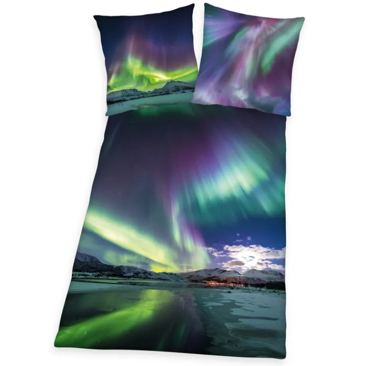 Die blau-türkise Renforcé-Bettwäsche POLARLICHTER misst 135 x 200 cm und ist damit ideal für Kinder und Jugendliche geeignet. Das romantische Design zeigt ein außergewöhnliches Phänomen der Natur. POLARLICHTER ist eine Kinder-Bettwäsche von HERDING. Die Größe ist für ältere Kinder ab dem Grundschulalter sowie für Jugendliche geeignet. Das Set besteht aus zwei Teilen, einem Bezug für die Decke und einem Kopfkissenbezug mit den Maßen 80 x 80 cm. Das Design zeigt grüne, türkise, blaue und violette Polarlichter über einer winterlichen Landschaft mit Bergen und Gewässern.