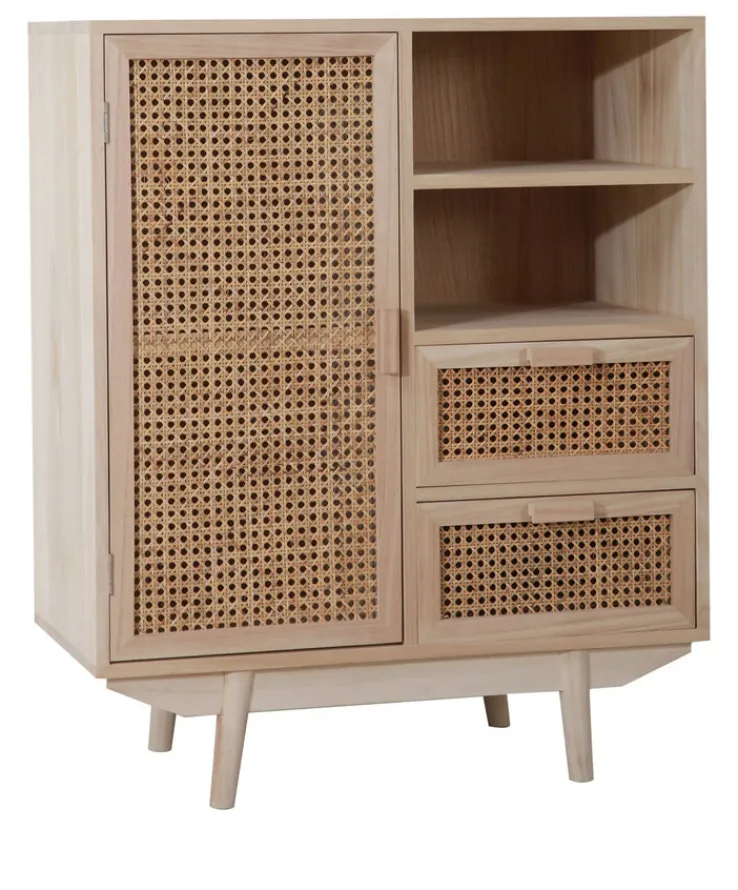 Das Highboard kombiniert Paulownia Massivholz mit furnierter Holznachbildung und Einsätzen aus Rattan-Geflecht. Mit ihrem freundlichen, natürlichen Look zaubert es eine gemütliche Atmosphäre in den Wohnraum. Schlichte, kaum auffallende Griffe perfektionieren das naturbelassene Design. Ein Highlight ist das Highboard auch durch ihren großzügigen Stauraum. In zwei Fächern und zwei Schubkästen bietet es viel Platz für Alltagsgegenstände, während die geräumige Oberfläche als Ablage dient. Für ein harmonisches Ambiente lässt sich das Highboard mit weiteren Möbeln mit Rattan-Fronten kombinieren.