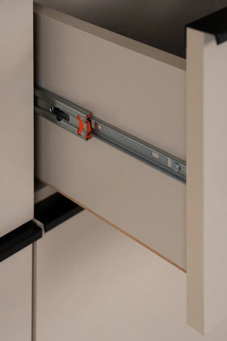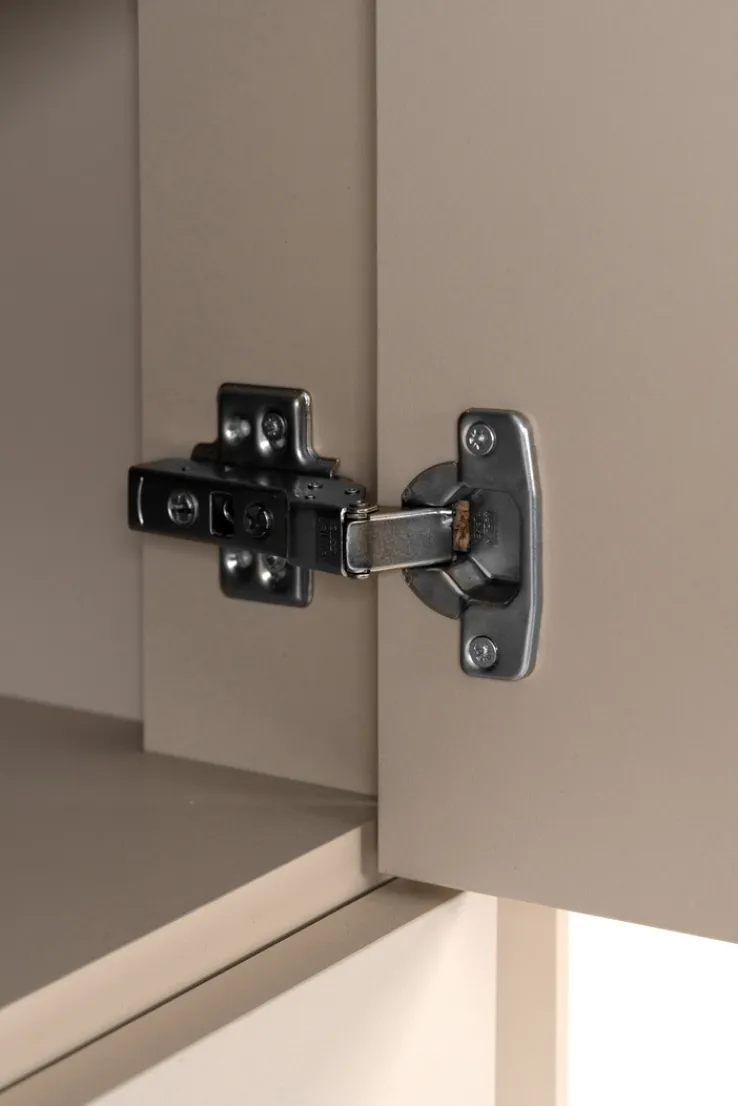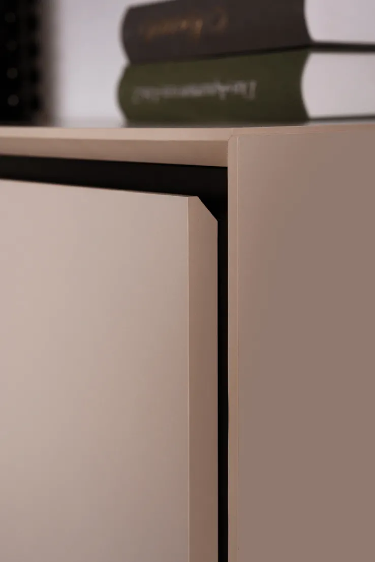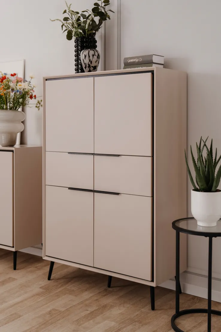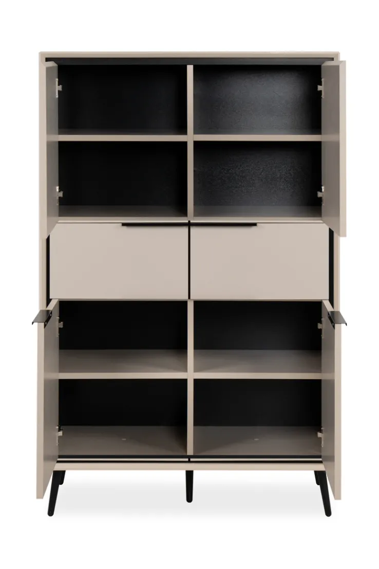 Die Hauptfarbe Beige mit einem sandfarbenen Ton verleiht dem Möbelstück eine zeitlose Eleganz, während die schwarzen Akzente für einen modernen Kontrast sorgen. Die vier Drehtüren und zwei Schubkästen bieten ausreichend Platz für die Aufbewahrung von Gegenständen, und die vier Einlegeböden ermöglichen eine flexible Nutzung des Innenraums. Gefertigt aus einer Kombination von Holznachbildung, Kunststoff und Metall, überzeugt das Highboard durch seine robuste Bauweise. Die mitteldichte Faserplatte (MDF) ist mit Melaminharz beschichtet, was die Oberfläche besonders pflegeleicht und widerstandsfähig macht. Die Aluminiumgriffe unterstreichen das moderne Design und bieten eine angenehme Haptik. Dank der Soft-Close-Funktion schließen die Türen sanft und leise, was den Bedienkomfort zusätzlich erhöht.