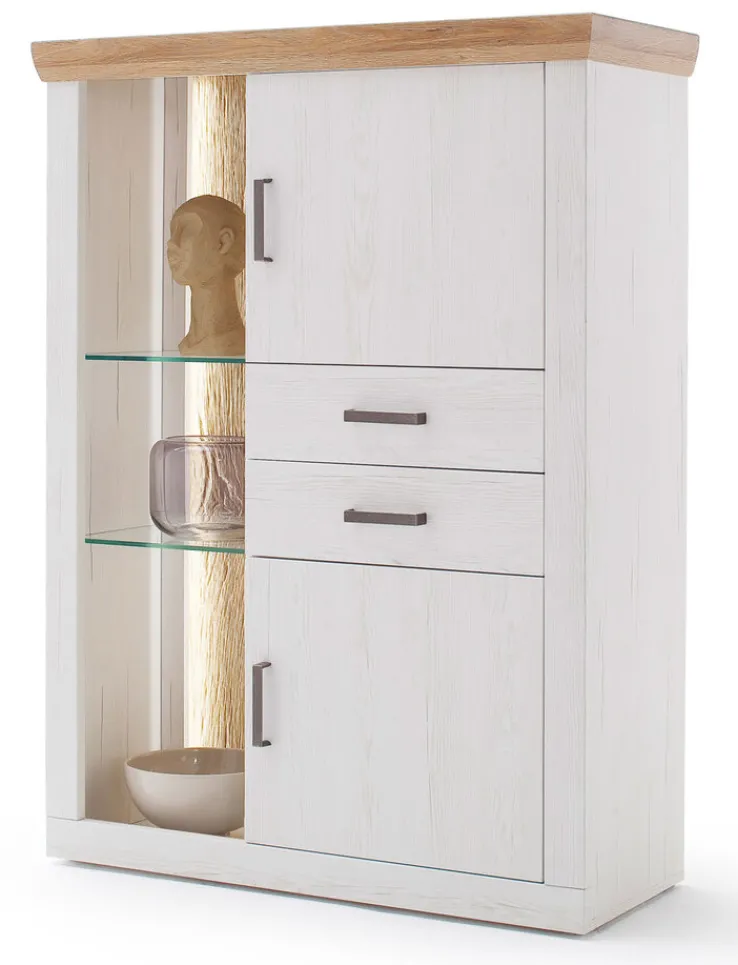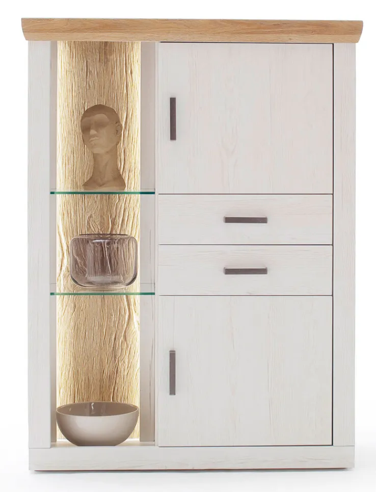 Das Highboard der Serie CALVA vereint Funktionalität und ansprechendes Design. Mit einer Breite von 106 cm, einer Höhe von 142 cm und einer Tiefe von 40 cm bietet es ausreichend Stauraum für diverse Wohnaccessoires. Die Hauptfarbe des Möbelstücks ist ein elegantes Braun-Weiß, das durch die Dekorfarbe Pinie Aurelio und Grandson Oak ergänzt wird. Diese Farbkombination verleiht dem Highboard eine warme und einladende Ausstrahlung, die sich harmonisch in verschiedene Wohnstile einfügt.