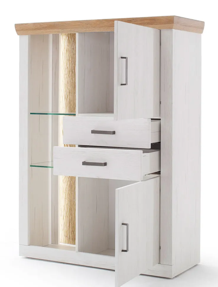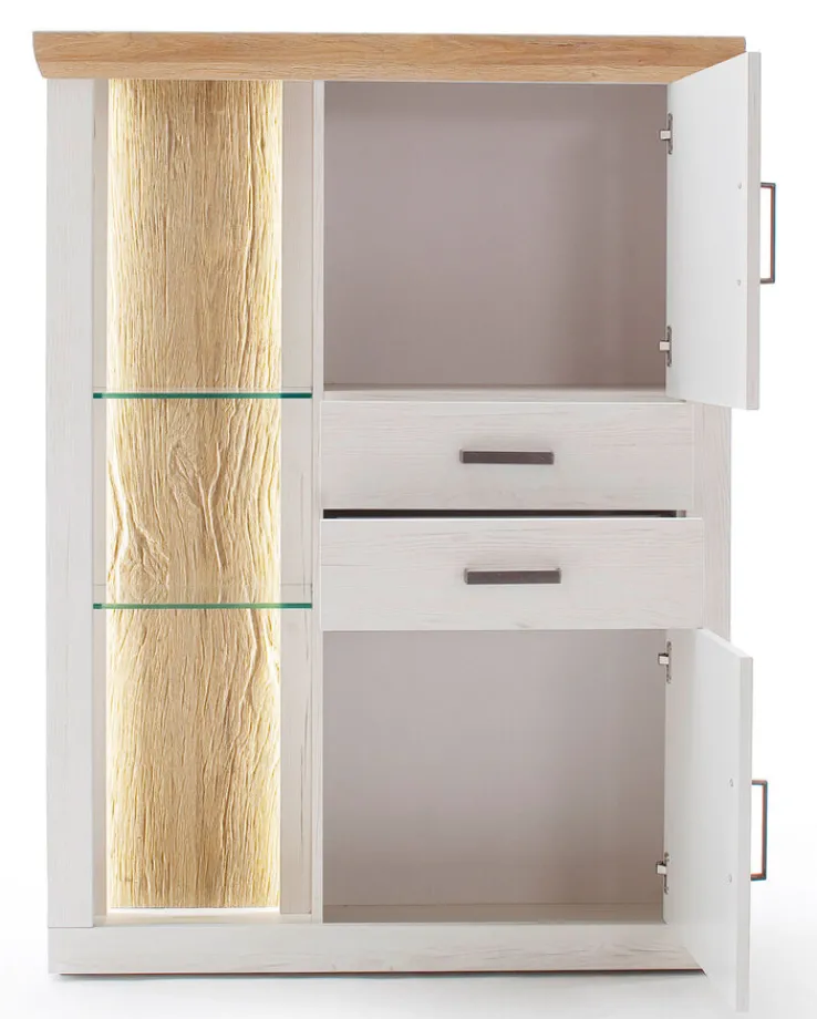 Das Material des Highboards besteht aus einer hochwertigen Holznachbildung und Klarglas, was für eine robuste und zugleich stilvolle Optik sorgt. Die Glasart ist Klarglas, das in den offenen Fächern des Highboards eingesetzt wird und eine klare Sicht auf dekorative Elemente ermöglicht. Die klaren Linien und die natürliche Holzoptik machen das Highboard zu einem zeitlosen Möbelstück, das sowohl in modernen als auch in klassischen Einrichtungen seinen Platz findet.