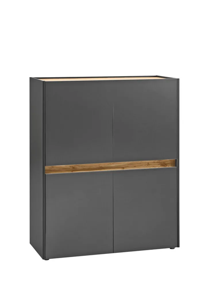 Das Highboard aus der Serie CITY präsentiert sich in einem modernen und skandinavischen Stil, der sich nahtlos in verschiedene Wohnräume einfügt. Mit einer Breite von 100 cm, einer Höhe von 122 cm und einer Tiefe von 40 cm bietet es großzügigen Stauraum. Die vier Drehtüren und vier Einlegeböden ermöglichen eine flexible Nutzung des Innenraums. Das Highboard ist in einem eleganten Anthrazit gehalten, ergänzt durch ein dekoratives Element in Wotan Eiche, das dem Möbelstück eine warme Note verleiht.
