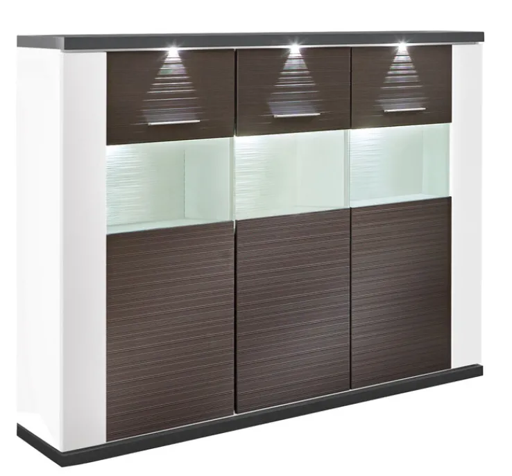 Die Hochkommode verfügt über drei Türen und eine stimmungsvolle LED-Frontbeleuchtung. Das Besondere an der Serie Manhattan ist die Front aus Holznachbildung mit Dekorfolie in Hochglanz Weiß Arctic. Die Absetzung in hochwertiger Dekorfolie Graphit geschroppt bildet einen aparten Kontrast dazu. Integriert in die Tür ist Klarglas, das den Blick auf eine Vitrine mit der Tiefe von 41,6 cm freigibt. Die Griffe des Highboard MANHATTAN sind aus Metall und silberfarben. Die LED-Beleuchtung der Front ist integriert, eine Beleuchtung der Vitrine ist optional möglich.