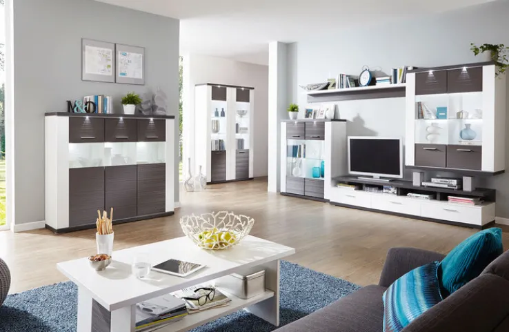 Im Trend liegt dieses moderne Highboard MANHATTAN in den Maßen 145,1 cm x 130,6 cm in Arctic Weiß und Graphit.