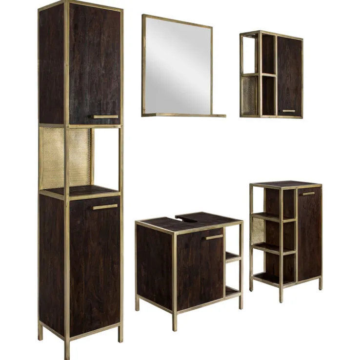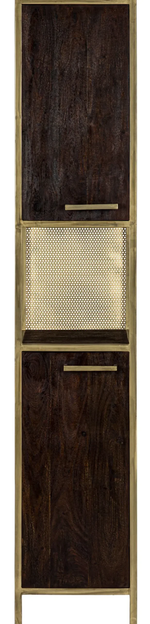 Der Hochschrank GOLDEN BATH besteht aus antikgoldfarbigem Eisen und dunkelbraun gebeiztem Mango Massivholz. Mit seiner edlen Farbkombination zieht er alle Blicke auf sich. Damit die Feuchtigkeit im Badezimmer den Oberflächen keinen Schaden zufügt, sind sie mit Öl behandelt. Zusätzlich zu seinem eleganten Look überzeugt der Hochschrank mit viel Stauraum. In einem offenen und mehreren geschlossenen Fächern bietet er ausreichend Platz für Handtücher, Pflegeprodukte und vieles mehr.
