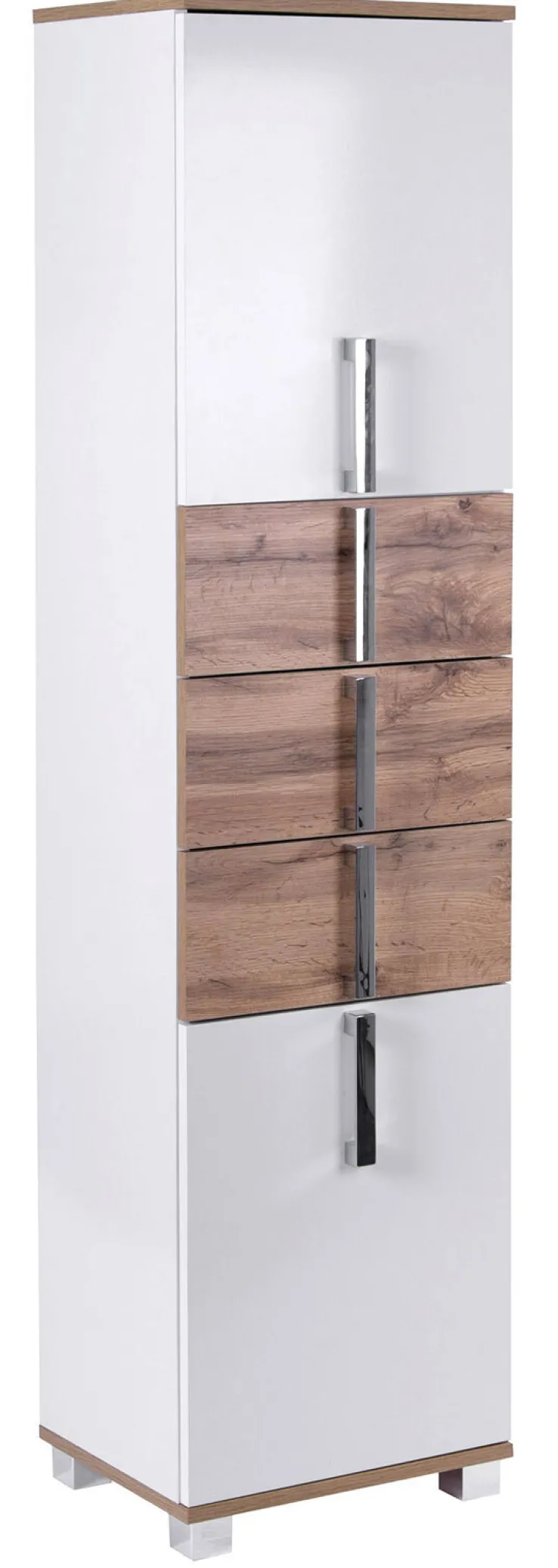 Hochschrank LUCA ist 40,3 x 163,7 cm groß und fällt mit der Farbkombi Weiß / Eiche Landhaus sofort ins Auge. Stilvoller können Badutensilien gar nicht verstaut werden!