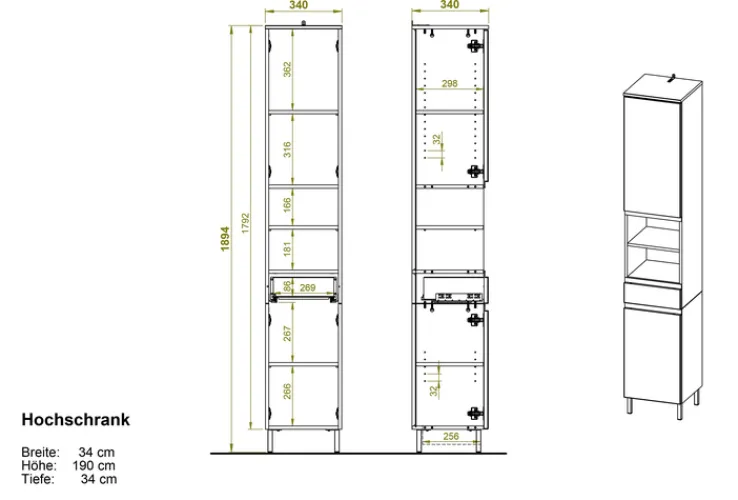 Hinter zwei Drehtüren, in zwei offenen Fächern und einer Schublade finden im Hochschrank SOPHIE 34x190x34 cm weiß/Grandson-Eiche Nb. Badutensilien bequemen Stauraum. Das Modell misst 190 x 34 x 34 cm bei einem Gewicht von knapp 30 kg.