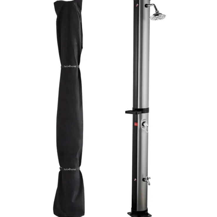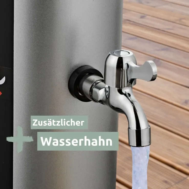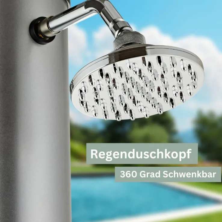Darunter stellen, vom Urlaub träumen: Der Regenduschkopf und das mit Sonnenenergie aufgeheizte Wasser vermitteln das Gefühl, unter einem tropischen Wasserfall zu stehen. Doch das ist nicht alles, was diese schöne und praktische Gartendusche mitbringt. Der Duschkopf ist schwenkbar, der Wasserstrahl lässt sich in jede gewünschte Richtung lenken. Am zusätzlichen Wasserhahn kann temperiertes Wasser direkt entnommen werden, etwa, um das Planschbecken für die Kinder zu füllen. Schutzhülle und Montageset gehören zum Lieferumfang. Bitte Aufbau- und Pflegehinweise am Artikel beachten.