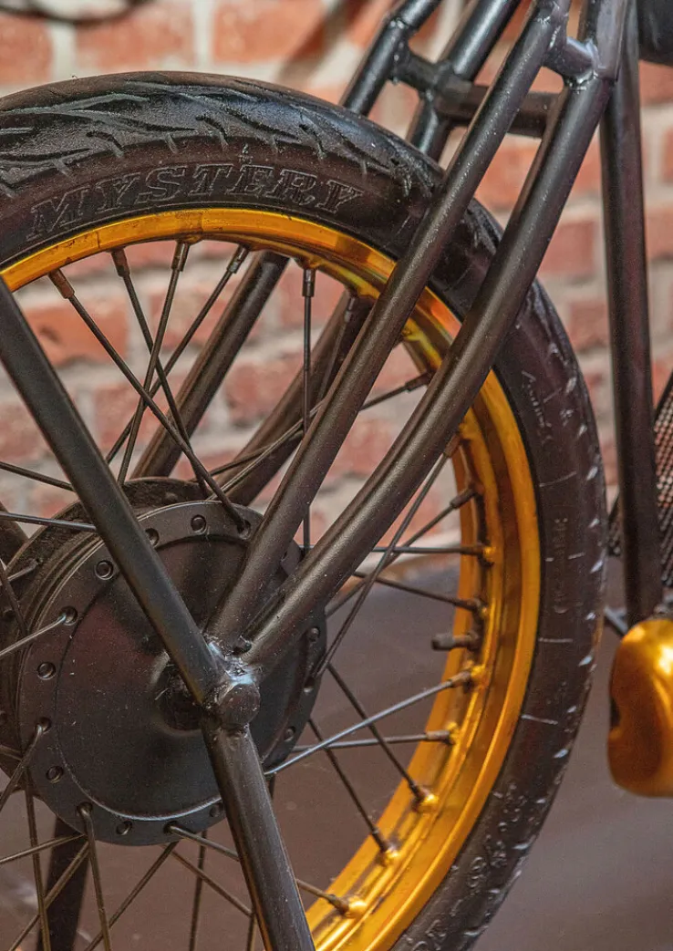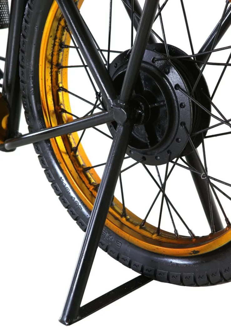 Das extravagante Objekt ist aus hochwertigem Mangoholz gefertigt, gebeizt und lackiert sowie mit Metallkomponenten versehen. Die INTERhome Bar RIDE lädt zu einem Ritt in vergangene Zeiten ein.