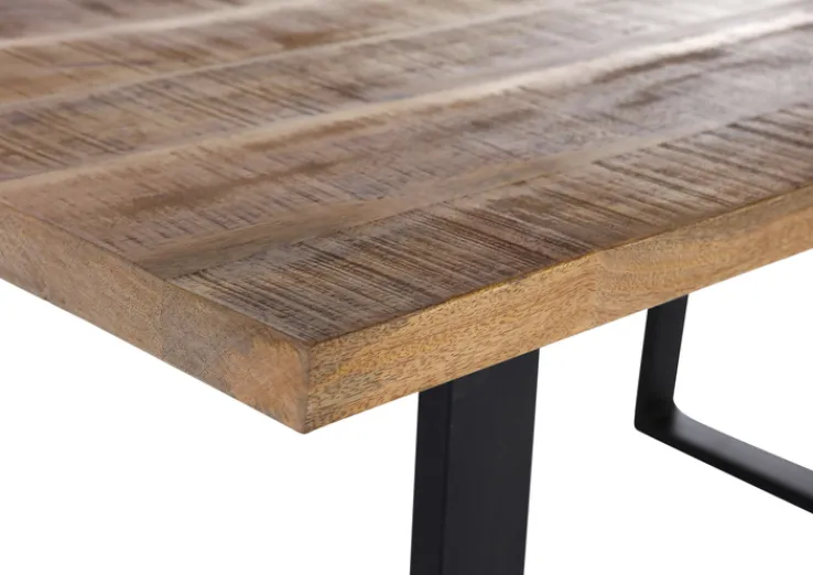 Die robuste Tischplatte aus massivem Mango-Holz, sorgfältig sägerau bearbeitet verleiht dem INTERhome Esstisch BARNEY eine einzigartige Haptik. Die warme, natürliche Holzfarbe wird durch die Beizung und Lackierung perfekt in Szene gesetzt. Das solide Kufengestell aus schwarz lackiertem Metall sorgt für Stabilität und Langlebigkeit, während die massive Tischplatte nicht nur optisch überzeugt, sondern auch widerstandsfähig gegenüber den Herausforderungen des Alltags ist.