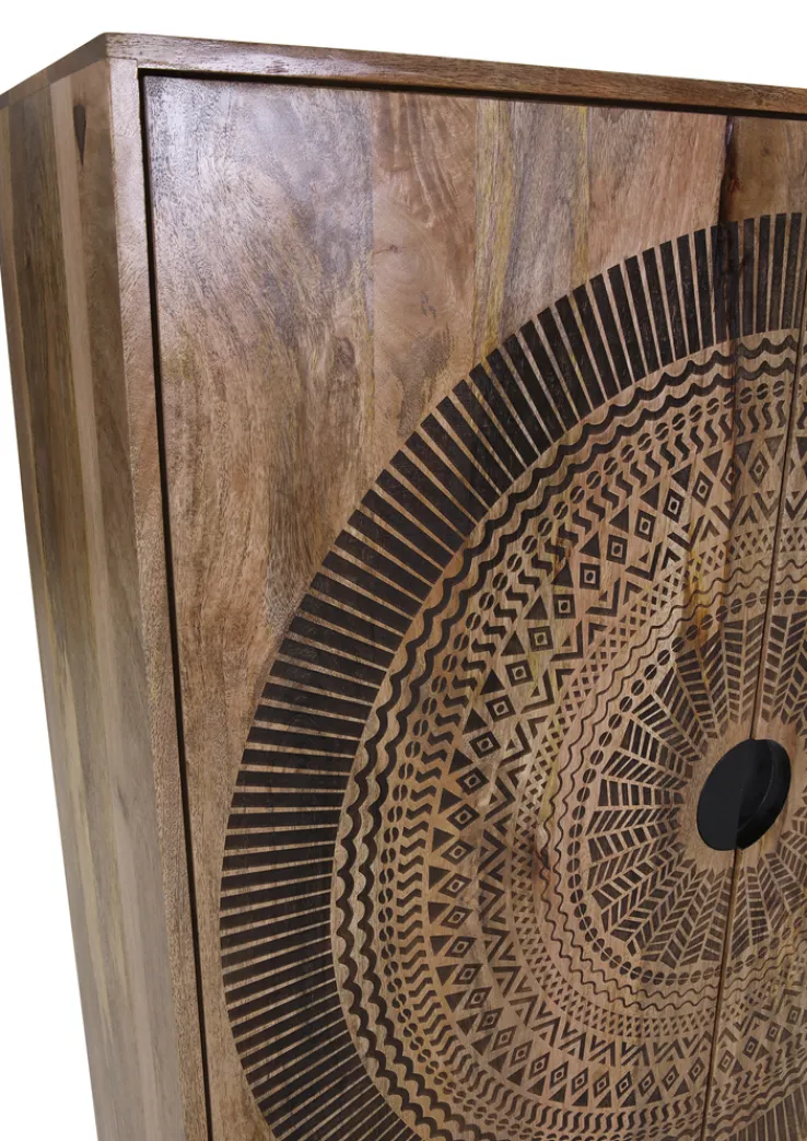 Das rustikale Highboard SANTA CRUZ der Marke INTERhome fügt sich perfekt in Wohn- oder Essbereiche ein. Besonders harmonisch wirkt es in einem natürlichen oder Boho-Ambiente. Zwei Drehtüren mit eingefrästen Griffen und eine markante Front mit aztekisch inspirierter Lasergravur machen das Möbelstück zum stilvollen Mittelpunkt im Raum. Zwei durchgehende Konstruktionsböden bieten viel Stauraum. Die Kombination aus warmer Holzstruktur und grafischem Design setzt gezielte Kontraste und verleiht dem Wohnzimmer, Essbereich oder Schlafzimmer Charakter, Ausdruck und Tiefe.