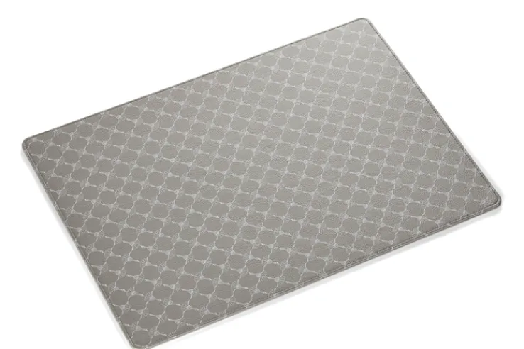 Die Oberfläche besteht aus pflegeleichtem Kunstleder in einem grau-weißen Farbton und zeigt ein dezentes, wiederkehrendes Muster mit geometrischen Elementen. Die strukturierte Textiloberfläche verstärkt den modernen Stil und sorgt für eine ansprechende Haptik.