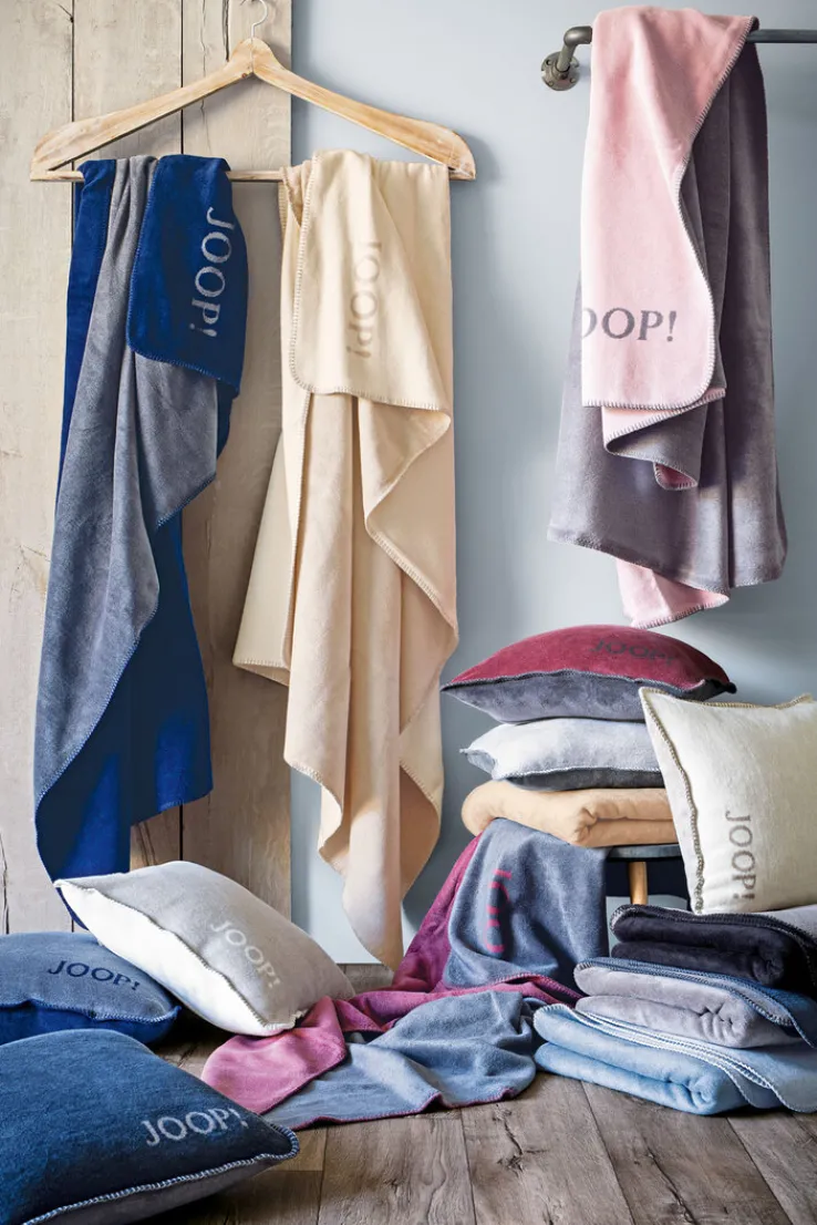 Die Wohndecke der Serie UNI DOUBLEFACE präsentiert sich in einem dezenten Beigeton mit ecrufarbenem Akzent und ist mit einer sichtbaren Kettelnaht eingefasst. Das Design ist einfarbig gehalten, auf einer Seite mit einem klaren JOOP!-Schriftzug, der sich kontrastierend vom Hintergrund abhebt. Die Oberfläche wirkt samtig und weich, was auf die Materialzusammensetzung aus 58 % Baumwolle, 35 % Polyacryl und 7 % Polyester zurückzuführen ist. Durch das Mischgewebe entsteht eine angenehme Haptik und ein gleichmäßiges Erscheinungsbild.