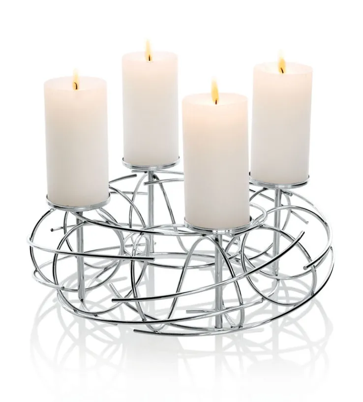 Der JUSTINUS Adventskranz LIFE STYLE besteht aus einem eleganten, silberfarbigen Metallgeflecht und vier Kerzenhaltern. Er ist für die Verwendung mit großen Stumpenkerzen gedacht und sorgt während der Adventszeit für romantischen Kerzenschein. Wer mit einem minimalistischen Adventskranz nur wenig anfangen kann, kann ihn mit geringem Aufwand in eine prachtvolle Weihnachtsdekoration verwandeln. Mit Tannengrün, sonstigen immergrünen Zweigen, Schleifen und etwas getrockneten Gewürzen wie Sternanis oder Zimtstangen sieht der chromfarbige Adventskranz sofort natürlicher aus.