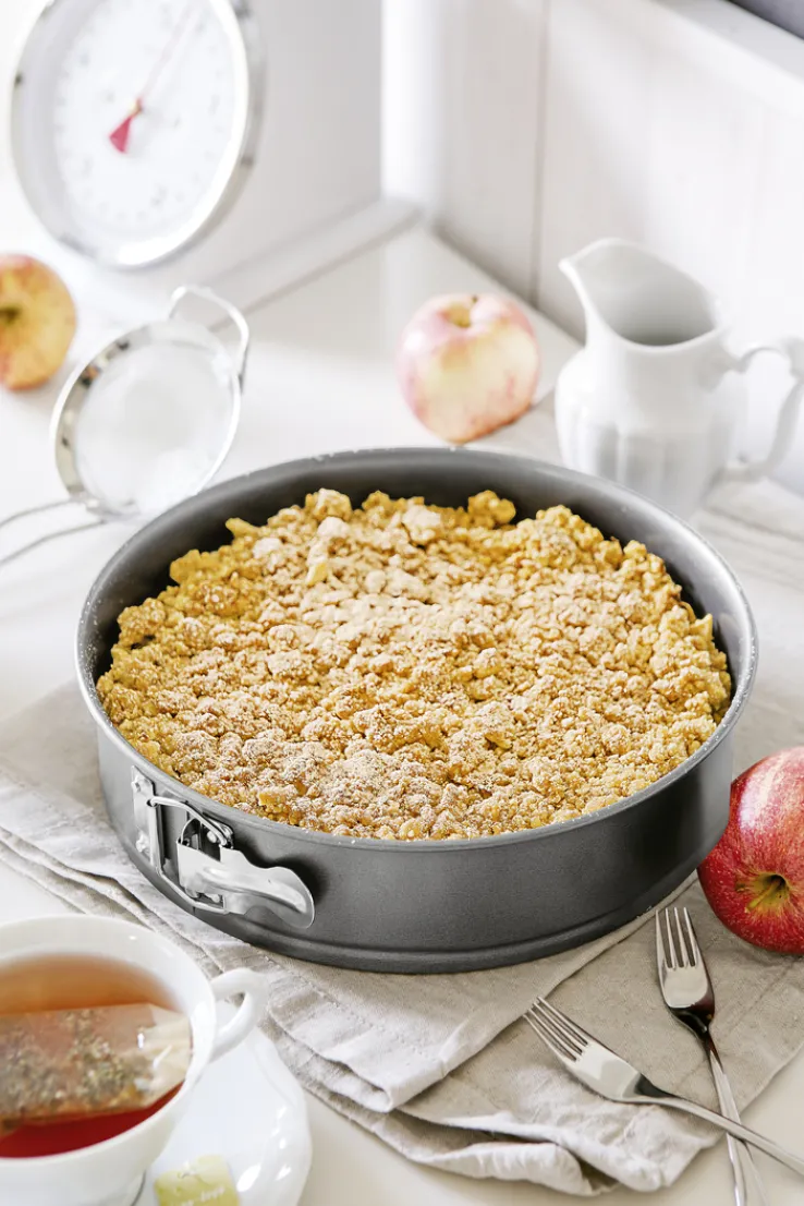 Die Backform besteht aus Flachboden und Ring. Das Metall ist mit einer Antihaftbeschichtung versehen, die ein Anbrennen verhindern kann. Der Metallring lässt sich mithilfe des Spannhebels auslaufsicher schließen und nach dem Backen leicht wieder öffnen.