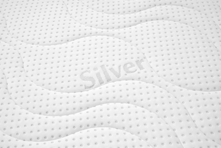 Diese Kaltschaummatratze in der Größe 180 x 200 cm bietet eine großzügige Liegefläche und eignet sich besonders für den Einsatz im Schlafzimmer. Die Matratze ist weiß und verfügt über eine feine, punktuelle Oberflächenstruktur mit dezentem Muster, das für eine optisch ruhige und gepflegte Ausstrahlung sorgt. Die Kanten sind mit einem grauen Band eingefasst, das für zusätzliche Formstabilität und eine klare Linienführung sorgt. Das Material besteht aus einem synthetischen Textilbezug mit einem Anteil von 72 % Polyester und 28 % Viskose. Die Oberfläche ist mit dem Schriftzug ‚Silver‘ gemustert und zeigt eine regelmäßige Steppung in Wellenform, die das Erscheinungsbild auflockert und die Atmungsaktivität unterstützt.