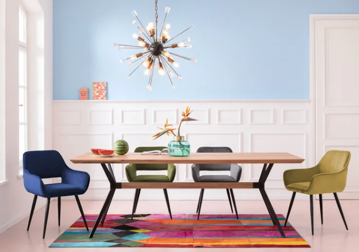 Der Unterbau der Sitzschale des Esszimmerstuhls besteht aus Metall und ist weich mit einem atmungsaktiven Polyschaum gepolstert. Der fein gesäumte Bezug ist aus strapazierfähigem Polyester gefertigt. Die leicht ausgestellten Füße sind aus Holz und haben furnierte Oberflächen.
