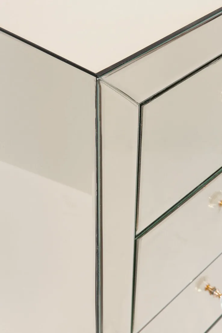 Der Korpus der Hochkommode ist aus einer mitteldichten Faserplatte mit lackierter Oberfläche gefertigt. In Verbindung mit Füßen aus massivem Tannenholz, einer verspiegelten Front sowie Griffen aus klarem Glas ist die KARE DESIGN Hochkommode ein absolutes Schmuckstück in allen Wohnräumen. Die fünf Schubkästen bieten reichlich Stauraum zur Aufbewahrung von Wäschestücken, Kleidungsaccessoires und anderen Gegenständen des täglichen Bedarfs. Durch ihre geringe Breite ist die Hochkommode ein idealer Ordnungshüter auch in kleinen Fluren oder im Schlafzimmer.