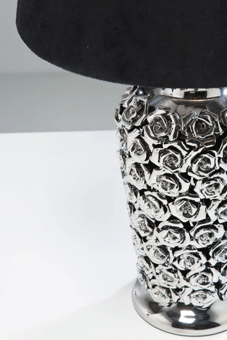Die Retrofit Tischlampe ROSE MULTI von KARE DESIGN schafft durch ihr außergewöhnliches Design in Schwarz/Silberfarbig und ein sanftes Licht eine einzigartige Atmosphäre. Stilvoll und elegant kontrastiert der Lampenfuß mit glänzenden Rosenblüten mit dem Lampenschirm in matter Velours-Optik.