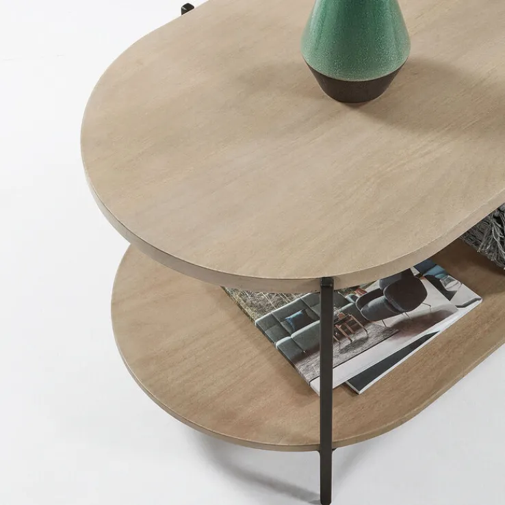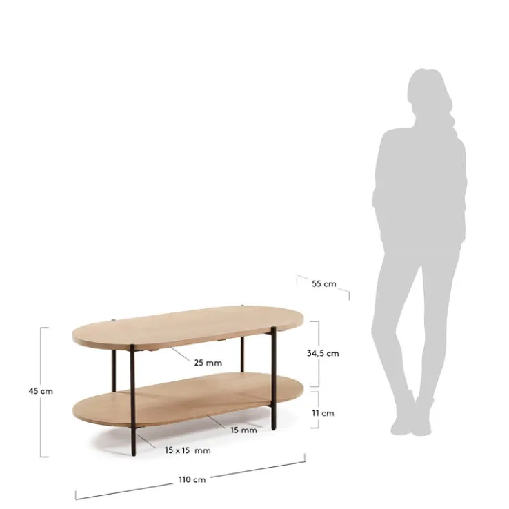 Das schlanke, fast schon grazile Gestell aus schwarzem Metall hält die beiden ovalen Tischplatten mit ihren 110 Zentimetern Länge und 55 Breite, der kleine Couchtisch wirkt mit 45 Zentimetern Höhe zierlich und mädchenhaft. Trotzdem hat Kave Home mit dem Couchtisch PALMIA in massivem Mangoholz (braun) ein starkes Einrichtungsstück geschaffen, das in allen modernen Interieurs trotz der spielerisch leichten Gestaltung für Ernsthaftigkeit steht.