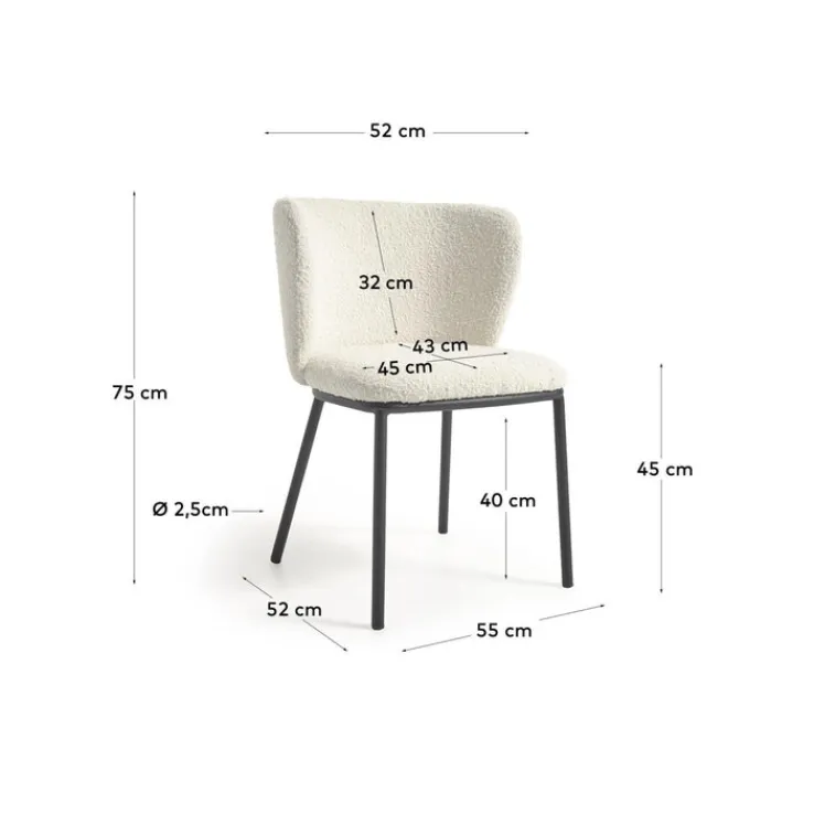 Der Kave Home Polsterstuhl CISELIA wird in einem praktischen 2er Set geliefert. Er bietet eine 55 cm breite und 43 cm tiefe Sitzfläche mit einer Sitzhöhe von 49 cm. Die Rückenlehne ist 32 cm hoch. Das weiße textile Material des Möbelstücks wird von einem schwarzen Vierfußgestell aus Stahl passend ergänzt.