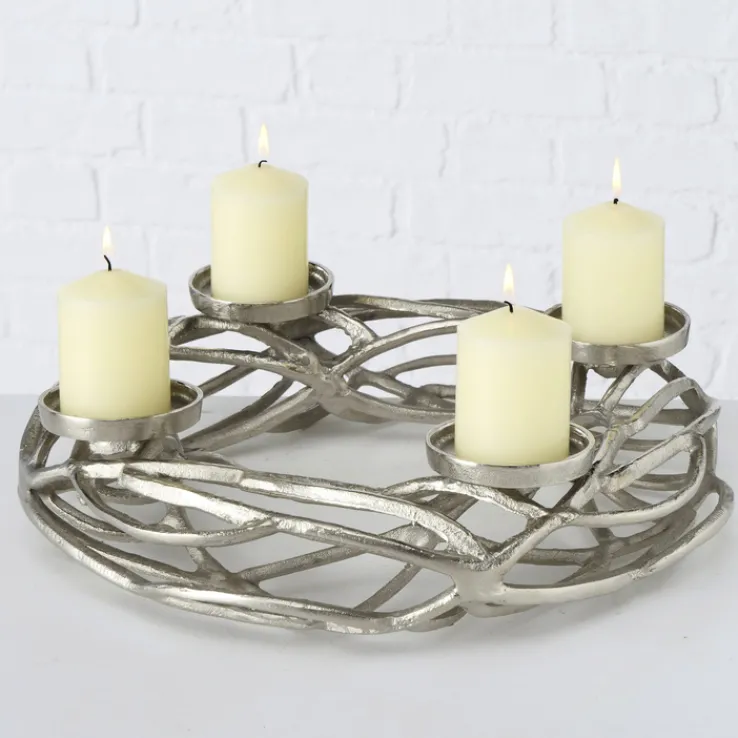 Der Kerzenleuchter Ringval ist aluminiumfarbig, bietet Platz für 4 Kerzen und hat einen Durchmesser von 40 cm.