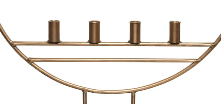 Dieser kupferfarbige, aus Eisen gemachte Kerzenständer ist 76 cm hoch und 64 cm breit. Einzelstehend kommt er besonders in Wohnbereichen als Dekoelement sehr gut zur Geltung. Von seinen Ausmaßen her passt der rund eingerahmte Kerzenständer am besten auf einen Beistelltisch, eine Kommode oder Empore. Bestückt werden kann er mit 4 Stabkerzen und bietet so auch bei Tageslicht einen außergewöhnlichen Blickfang. In seinem schlichten Design harmonisiert er ausnehmend gut mit geradlinigen, modernen Möbeln. Außerdem verträgt sich die Trendfarbe Kupfer sehr gut mit anderen Naturmaterialien, hauptsächlich mit Holz. Darüber hinaus ist der metallene Kerzenständer hochwertig verarbeitet und steht sicher auf einem 12 cm tiefem Holzbrett.