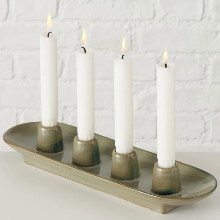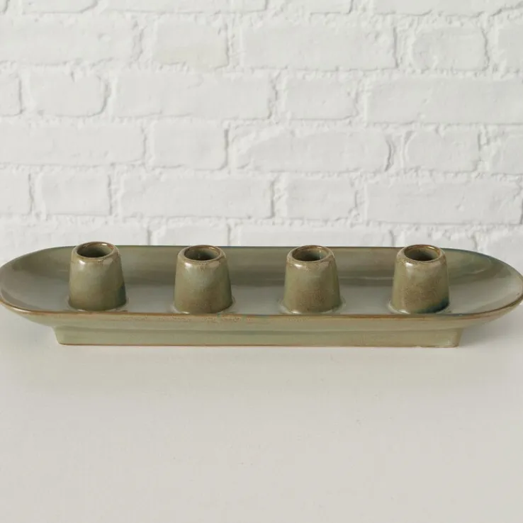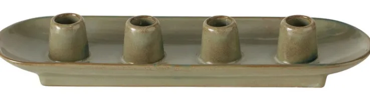 Der Kerzenständer PERUYA in sanftem Grün hat eine Höhe von 6 cm, eine Breite von 34 cm und eine Tiefe von 10 cm. Der schlichte und zeitlose Kerzenhalter ist für bis zu vier Stabkerzen geeignet und lässt sich vielfältig kombinieren. Der Kerzenständer PERUYA ist aus hochwertigem Porzellan gefertigt. Der sanfte Grünton des Kerzentellers harmoniert perfekt mit Kerzen in unterschiedlichen Farben und ist ein Blickfang in jedem Innenraum. Dank des schlichten Designs kann der Kerzenständer bei unterschiedlichen Einrichtungsstilen zum Einsatz kommen. Egal ob im Wohn- oder Esszimmer, im Schlafzimmer oder im Flur, der Kerzenständer sorgt überall für ein ansprechendes und gemütliches Ambiente.