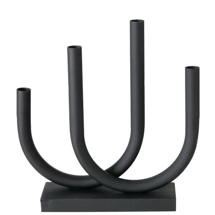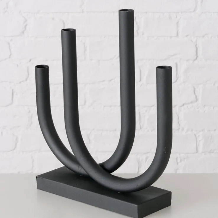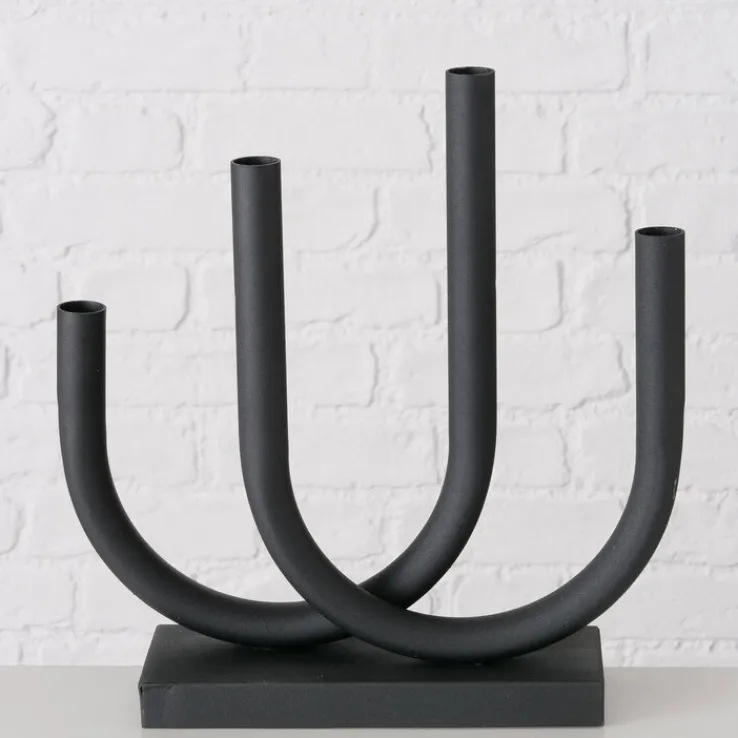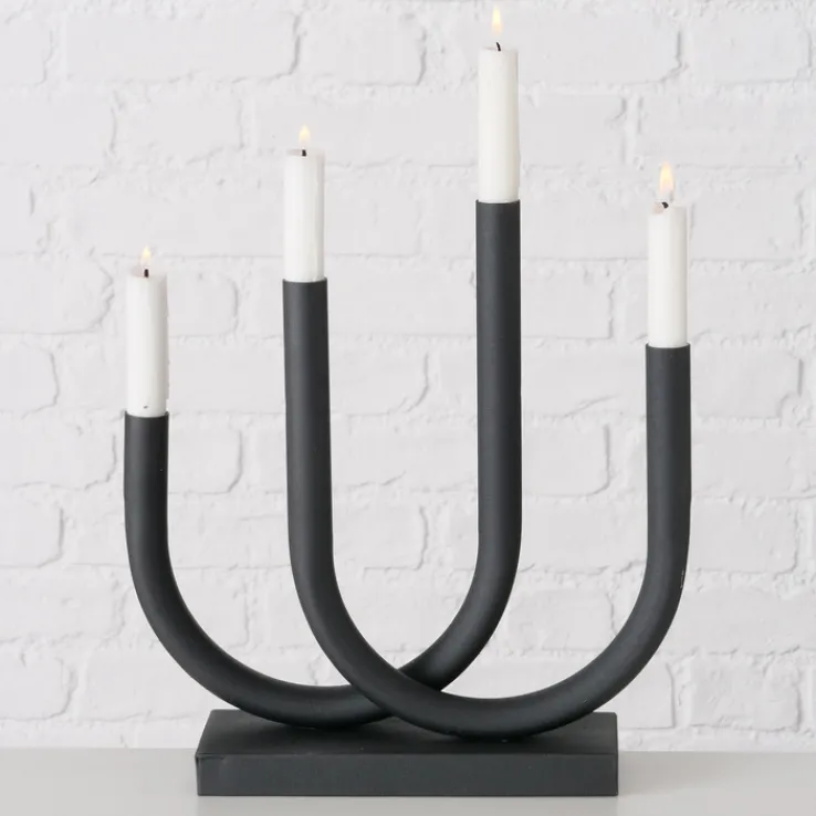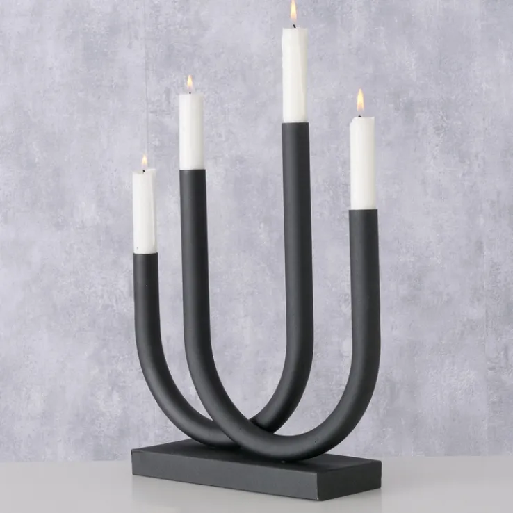 Der Kerzenständer TONIS besticht mit seinen U-förmigen Kerzenhaltern. Zwei der halbovalen Ständer vereinen sich zusammen zum Kerzenständer für vier Stabkerzen. Ein rechteckiger Standfuß sorgt für Stabilität. Der Kerzenständer ist komplett aus Metall in der Art von Eisen mit pulverbeschichteter Oberflächenbehandlung gearbeitet. Er ist mit seinem schwarzen Farbton ein eleganter Blickfang. Ergänzt mit vier weihnachtlichen Stabkerzen kann er die Basis für einen modernen Adventskranz bilden.