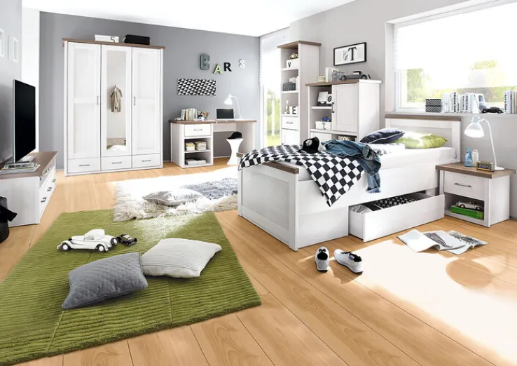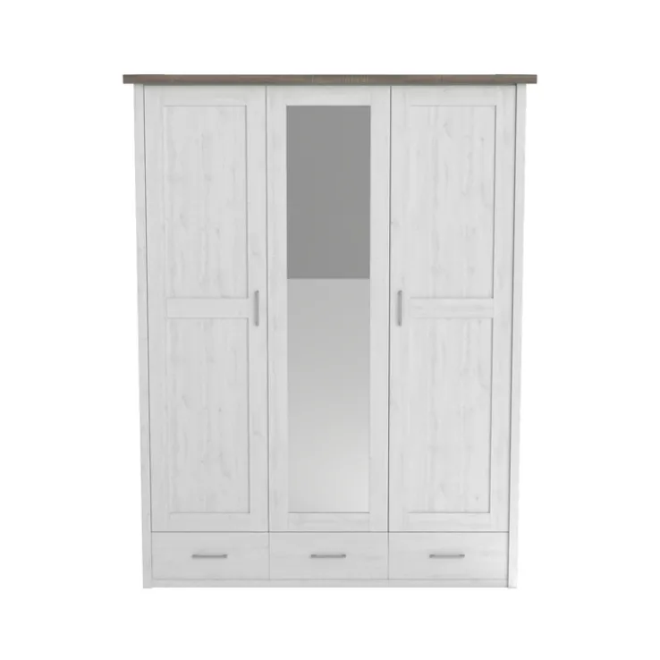 Der Schrank besteht aus einer Holznachbildung und Spiegelglas, was ihn robust und pflegeleicht macht. Im Inneren befinden sich eine Kleiderstange, drei Schubkästen und fünf Einlegeböden, die eine flexible Aufbewahrung ermöglichen. Die Dekorfarbe in Pinie unterstreicht den natürlichen Charme des Schranks. Dieses Möbelstück ist ideal für Familien, die Wert auf eine harmonische und funktionale Einrichtung legen.