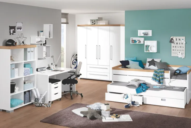 Der PAIDI Schreibtisch KIRA besteht aus einer Holznachbildung in Kreideweiß. Die Holz-Dekorfarbe ist Eiche.
