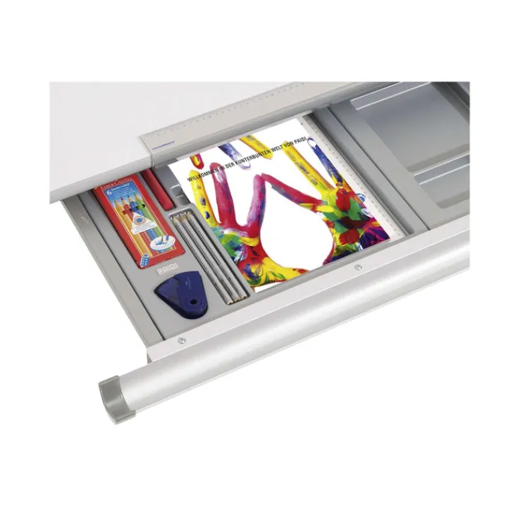 Die praktische Utensilienschale weist jedem Gegenstand seinen festen Platz zu, so dass nichts durcheinander fällt. Ausziehbar wie eine Schublade, ist die Utensilienschale flach. So bleibt unter der Schreibtischplatte immer noch ausreichend Platz für die Beine. In der Schale aus grauem Kunststoff finden alle Büromaterialien Platz, die am Schreibtisch benötigt wird. Für einen guten Start sorgt die Ausstattung von Faber-Castell, die mitgeliefert wird. Selbstverständlich bleibt noch ausreichend Platz für individuell gewählte Gegenstände – denn jeder arbeitet etwas anders.