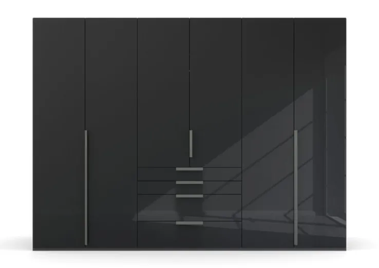Der Kleiderschrank PURISMA besteht aus hochwertiger Holznachbildung und misst 301 x 223 x 60 cm. Mit einer Kombination aus dunklem Farbglas und markanten Griffen wirkt der Schrank top modern. Noch bedeutender als sein trendige Design ist jedoch sein Stauraum. Hinter sechs Drehtüren mit Dämpfer bietet der Kleiderschrank Kleiderstangen und Ablageböden sowie einen Krawattenhalter. Darüber hinaus ist der Schrank mit vier Schubkästen in zwei Größen ausgestattet, die über einen praktischen Selbsteinzug verfügen.