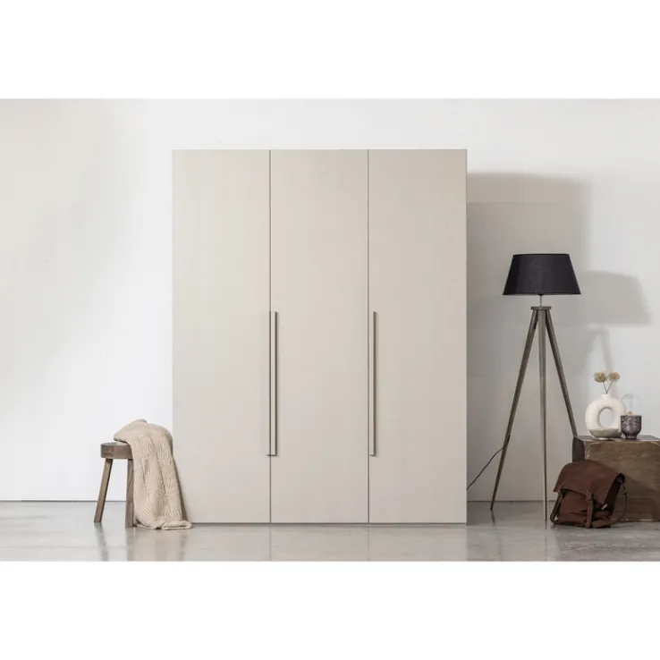 Der Kleiderschrank RENS in Kieselgrau mit Nussbaum-Dekor bietet mit einer Breite von 165 cm, einer Höhe von 210 cm und einer Tiefe von 58 cm großzügigen Stauraum für Kleidung und persönliche Gegenstände. Der Schrank verfügt über drei Drehtüren, eine Kleiderstange und drei Schubkästen, die vielfältige Aufbewahrungsmöglichkeiten bieten.
