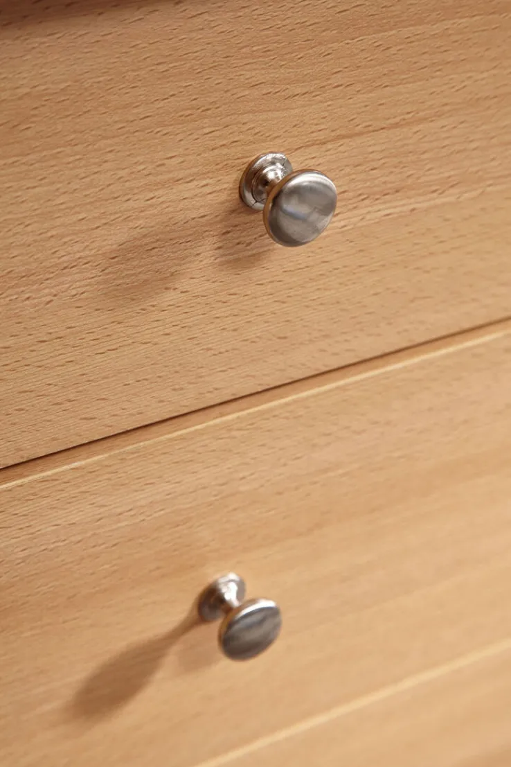 Die Kommode besteht aus buchefarbig folierter Holznachbildung und lässt sich mit maximal 30 kg belasten. Ihr klassisches Design perfektionieren die chromfarbigen Griffe. Noch wichtiger als die ansprechende Optik ist jedoch der umfassende Stauraum. In drei großen und zwei kleinen Schubkästen bietet das Möbelstück viel Platz für Wäsche und vieles mehr. Mit dem schlichten Aussehen und warmer Holzfarbe verleiht die Kommode dem Wohnraum zudem ein gemütliches Ambiente, in dem sich Familie und Gäste wohlfühlen.