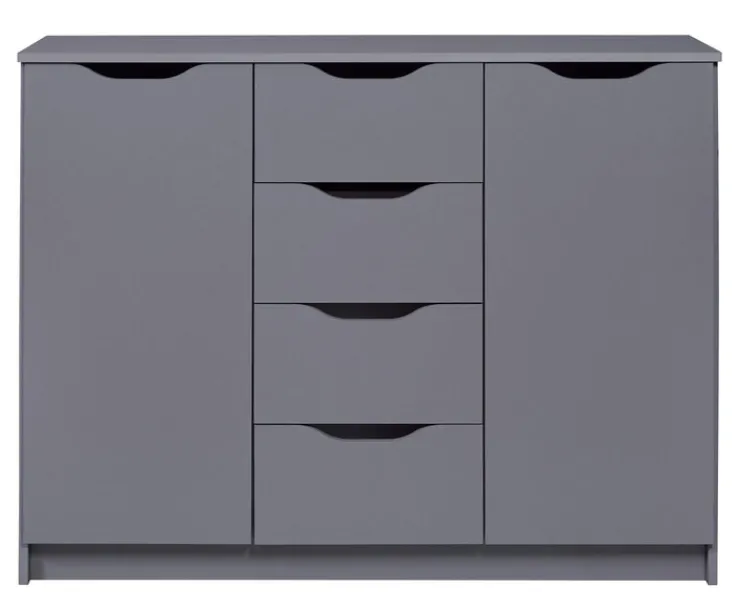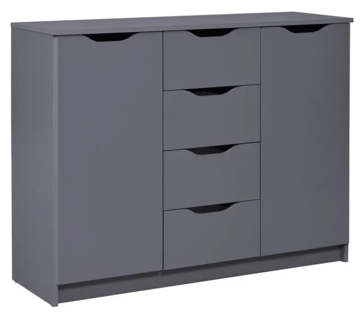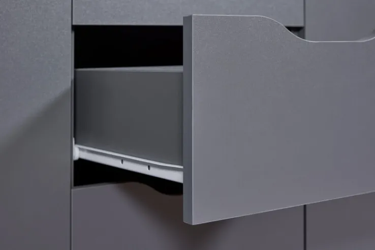 Die Kommode LION ist aus graphitgrauer Holznachbildung gefertigt. Ihre dekorativen Grifföffnungen verleihen der Front eine wohnliche und harmonische Atmosphäre. Die Kommode ist Teil einer umfangreichen Serie von Aufbewahrungsmöbeln gleichen Namens. Sie kann mit diversen Elementen in verschiedenen Größen und Formen kombiniert werden.
