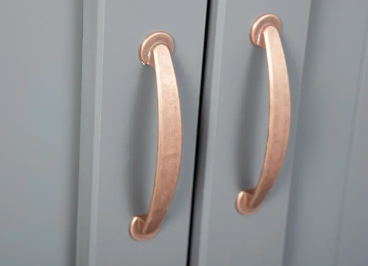 Die Kommode NICLAS 3.1 ist 90 cm breit, 86 cm hoch und 45 cm tief. Sie ist aus Massivholz in Grau. Kupferfarbene Griffe, 2 Drehtüren und 2 Schubkästen gehören zur Ausstattung.