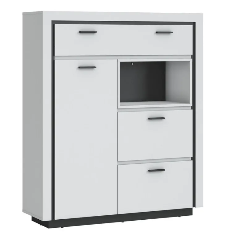 Die Kommode aus der Serie TORTONA I besticht durch ihr modernes Design in Alpinweiß und Schwarzperl. Mit einer Breite von 119 cm, einer Höhe von 141 cm und einer Tiefe von 37 cm bietet sie ausreichend Stauraum für diverse Wohnbereiche. Die klare Linienführung und die kontrastreiche Farbgebung verleihen dem Möbelstück eine zeitlose Eleganz, die sich nahtlos in verschiedene Einrichtungsstile einfügt.