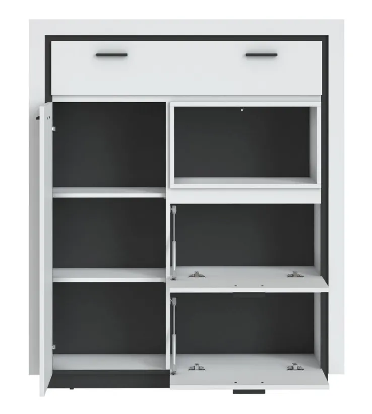 Gefertigt aus hochwertiger Holznachbildung, überzeugt die Kommode nicht nur optisch, sondern auch durch ihre Funktionalität. Sie verfügt über zwei Einlegeböden und mehrere Schubladen, die mit einer Soft-Close-Funktion ausgestattet sind, um ein sanftes und leises Schließen zu gewährleisten. Die Griffe in Schwarz unterstreichen das moderne Erscheinungsbild und bieten gleichzeitig eine praktische Handhabung. Diese Kommode ist die ideale Lösung für alle, die Wert auf Design und Funktionalität legen.