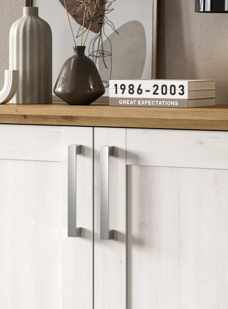 Die silberfarbigen Griffe brechen bewusst mit der sonst leicht antik angehauchten Optik der VERONA Kommode, zugleich wird die Grifffarbe auch an den Standfüßen erneut aufgegriffen. Der mittige Korpus wird von einem schönen, warmen Braunton umhüllt, im Innenbereich besticht die Kommode mit viel flexibel nutzbarem Stauraum für kleine und große Dinge.