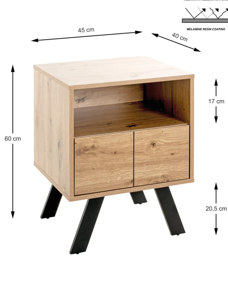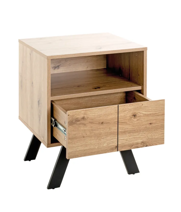 Diese 45 x 60 x 40 cm große Konsole kombiniert einen braunfarbiger Konsolenkörper mit einem schwarzfarbigen Vierfußgestell. Die Beine sind aus stabilem, pulverbeschichtetem Stahl. Der Konsolenkorpus mit Holzoptik ist rechteckig. Er enthält ein offenes Fach und einen Schubkasten. Außerdem kann die Oberseite als Ablagefläche genutzt werden. Das Möbelstück kann mit bis zu 35 kg belastet werden.