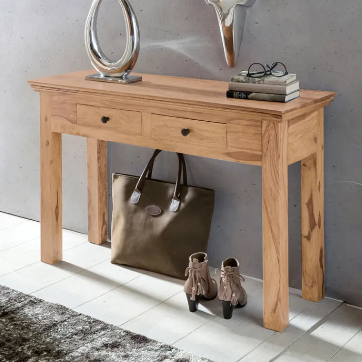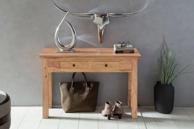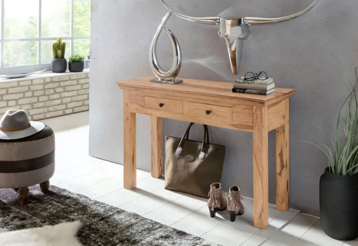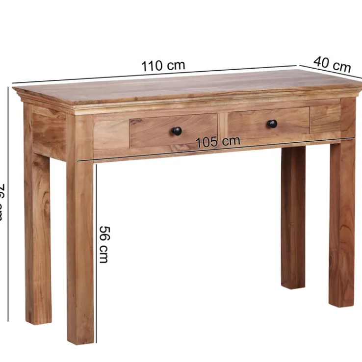 Der formschöne Konsolentisch mit den Maßen 110 x 76 cm ist eine Bereicherung für den modern oder klassisch eingerichteten Wohnbereich. Durch das stilvolle Design ist der Tisch aus Akazie in der Farbe Braun ideal für Wohnzimmer, Esszimmer oder die Diele. Zwei Schubkästen bieten viel Platz für diverse Kleinteile, Schlüssel oder Wohnaccessoires. Die Oberplatte des eleganten Konsolentischs ist als Ablage verwendbar und lässt viel Raum für verschiedene Dekorationsideen.